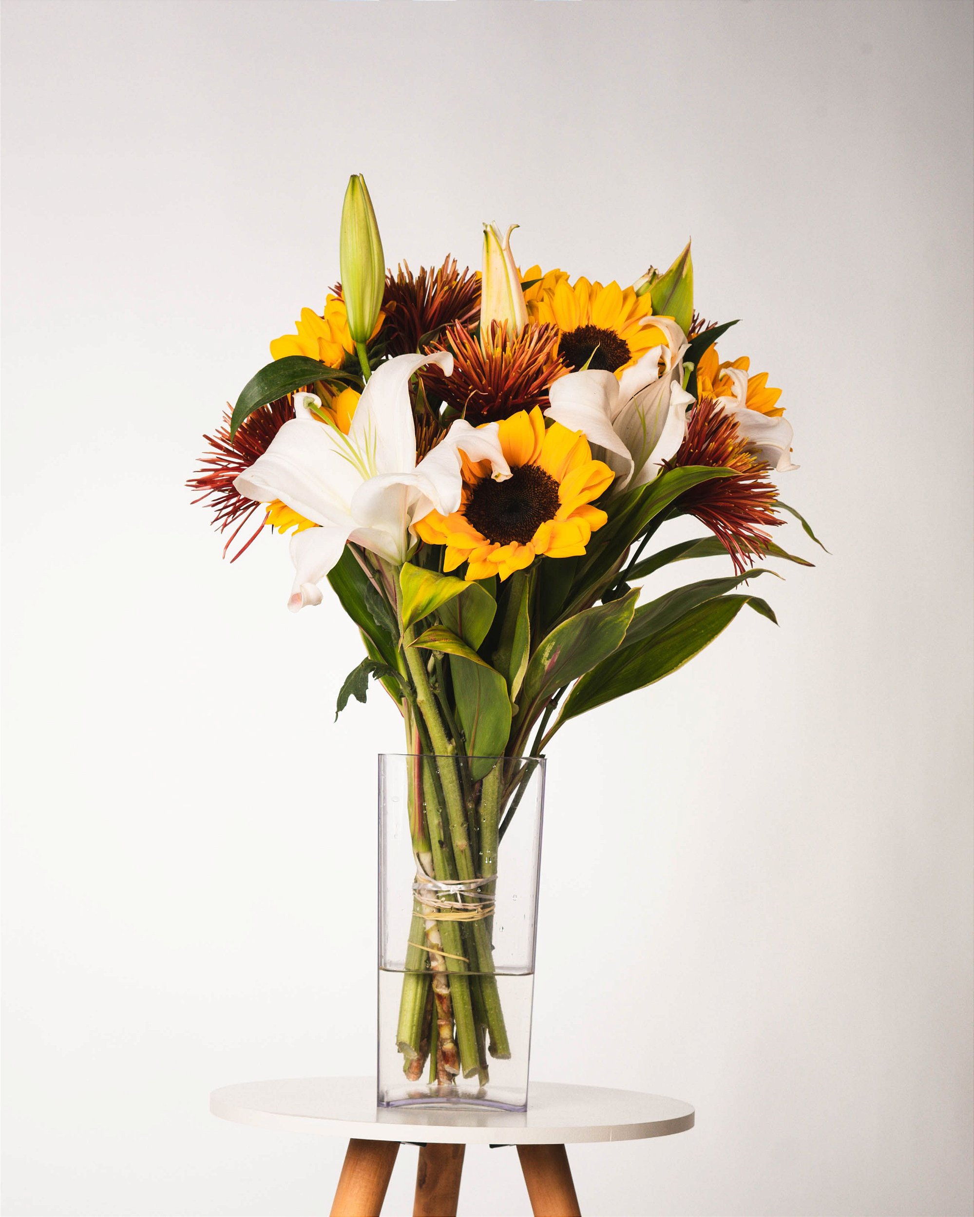Nosso buquê da linha premium, composto por lírios brancos, girassol e crisântemo. Elegante e sofisticado para presentear quem você ama! Embalado com papel  craft e laço de ráfia.
